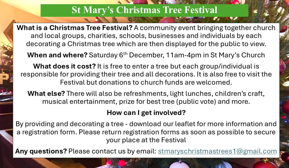 There will also be refreshments, light lunches, children’s craft, musical entertainment, prize for best tree (public vote) and more.
